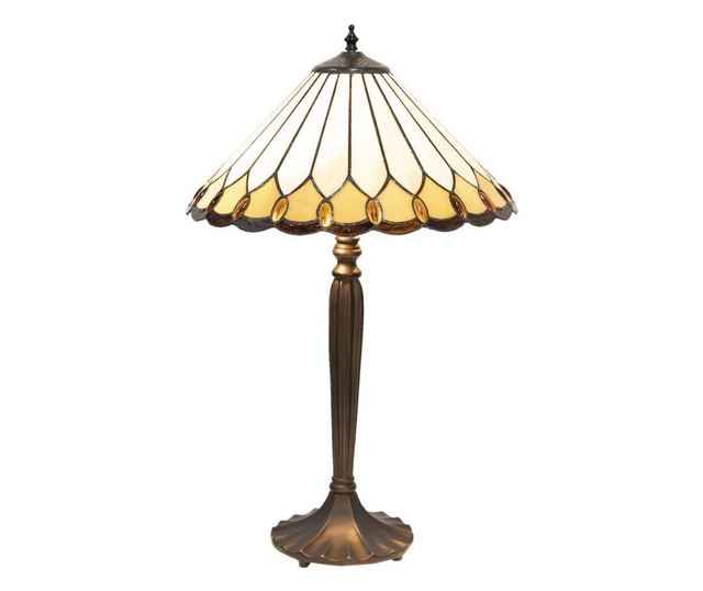 Ova prekrasna retro-klasična stolna svjetiljka ima izdržljivu bazu od polirezina i ručno izrađeni bijeli Tiffany stakleni abažur. Smeđa baza je bogato ukrašena, nadopunjujući tople, diskretne boje Tiffany stakla. Abažur prikazuje autentični ručno izrađeni Art Nouveau uzorak s draguljastim tonovima i pastelama, stvarajući skladnu ravnotežu svjetla. Baza ima starinski finiš koji naglašava iznimnu kvalitetu abažura.