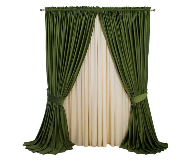 Zavjesa od poluprozirnog baršuna, maslinasto zelene boje, vrhunske kvalitete, koja će oplemeniti vaše prozore, opremljena širokom trakom (10 cm), koja omogućuje vješanje kako na stropnu šinu, tako i na galeriju s prstenovima.