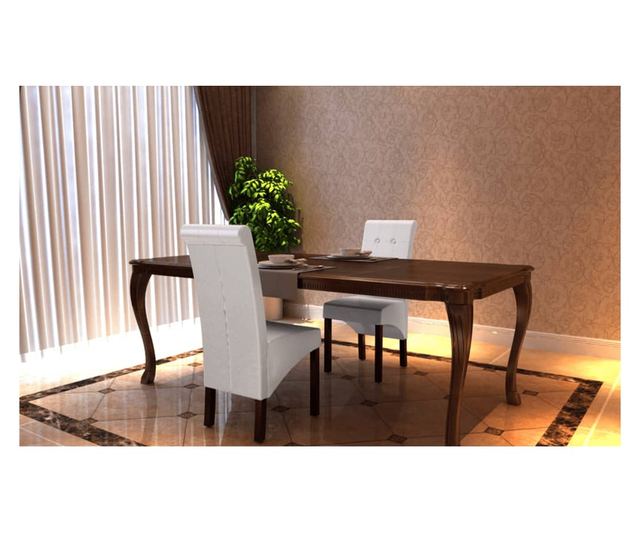 Ovaj set od 2 udobne kuhinjske stolice ima sjedala i naslone ergonomski oblikovane. Stolice se lako održavaju. Sjedala i nasloni su presvučeni umjetnom kožom. Noge su izrađene od masivnog smeđeg lakiranog drva, a rubovi su zaobljeni radi sigurnosti.