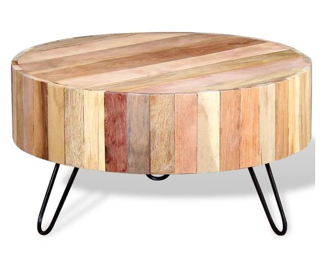 Ovaj stolić za kavu ručno je izrađen od recikliranog masivnog drva, koje je čvrsto, izdržljivo i vrlo lijepo, s karakteristikama različitih vrsta drva poput tikovine, manga, bagrema, recikliranog drva, tvrdog drva itd. Svaki korak radnog procesa provodi se s najvećom pažnjom, bilo da se radi o poliranju, bojanju, lakiranju, a vještina izrade doprinosi spektakularnom retro stilu. Lijepa vlakna drva čine svaki komad namještaja jedinstvenim i malo drugačijim od drugog. Okviri su izrađeni od izdržljivog željeza, dodajući robusnost stolu.