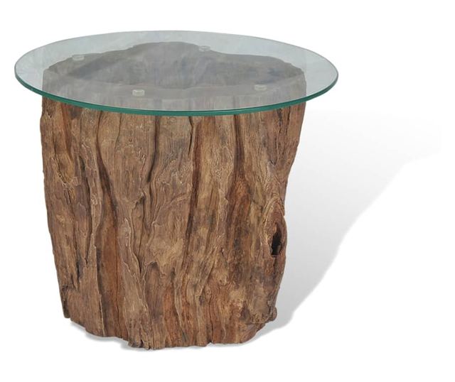 Ploča je izrađena od kaljenog stakla i nudi prostor za pića, vaze, košare s voćem ili druge ukrasne predmete. Može se koristiti i kao bočni stol. Izdržljiva i stabilna baza stola u obliku debla izrađena je od visokokvalitetnog tikovog drveta. Sastavljanje je jednostavno.