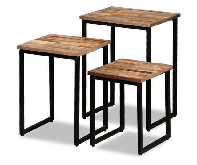 Ovaj set stolića za kavu izrađen je od recikliranog tikovog drva, pri čemu je svaki komad namještaja jedinstven i malo drugačiji od drugog. Reciklirano tikovo drvo je čvrsto, stabilno, izdržljivo i lijepo. Stolići su vrlo čvrsti i izdržljivi zahvaljujući nogama od čelika, koje upotpunjuju spektakularni industrijski stil.