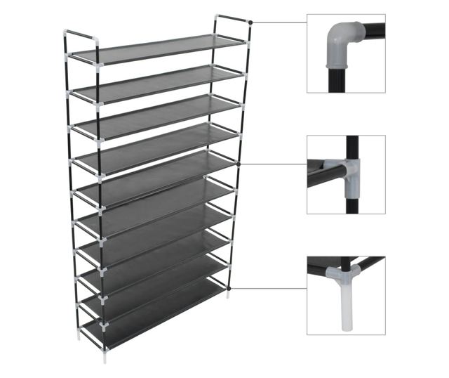 Ima tubularni metalni okvir, koji je lagan, a ipak čvrst, što čini policu za cipele prilično izdržljivom i lakom za premještanje. Ima deset prostranih polica izrađenih od ekološki prihvatljivog netkanog tekstila, koje pružaju dovoljno prostora za organiziranje cipela, a da nisu na vidiku.