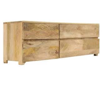 TV stalak izrađen je od masivnog drva manga i vrlo je stabilan i izdržljiv. Robusna ploča idealna je za postavljanje televizora i stereo sustava, kao i ukrasnih predmeta, poput vaza ili biljaka u loncima. HiFi ormarić s 4 ladice nudi dovoljno prostora za pohranu kako biste dobro organizirali DVD playere, igraće konzole, streaming uređaje, medijske nosače itd. Delikatno izrezbareni uzorak daje ormariću jedinstven izgled. Svaki korak u procesu izrade provodi se s najvećom pažnjom, bilo da se radi o poliranju, bojanju ili lakiranju. Ovaj proizvod je spreman za upotrebu; nije potrebna montaža.