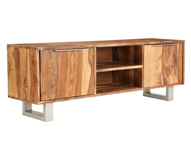 Ovaj TV ormarić izrađen je od masivnog drva sheeshama i može se koristiti i kao komoda ili HiFi ormar. Drvo sheeshama je tropsko tvrdo drvo, poznato po bogatoj teksturi i poznato i kao ružino drvo ili palisander. Svaki korak proizvodnog procesa provodi se s najvećom pažnjom, bilo da se radi o poliranju ili lakiranju. Umjetnost izrade i prekrasna tekstura drva čine svaki komad namještaja jedinstvenim i malo drugačijim od sljedećeg. Ovaj ormar ima čvrstu površinu na koju možete postaviti ukrasne predmete, poput košara s voćem ili vaza. Dizajniran s 2 pretinca i 2 ormarića, ovaj vam ormarić nudi dovoljno prostora za organiziranje DVD-ova, multimedijskih uređaja ili drugih malih predmeta na dohvat ruke. Ima dvije rupe na stražnjoj strani za kabele. Njegove čelične noge doprinose njegovoj čvrstoći, kao i modernom dizajnu specifičnom za 50-e godine. Sastavljanje je jednostavno.