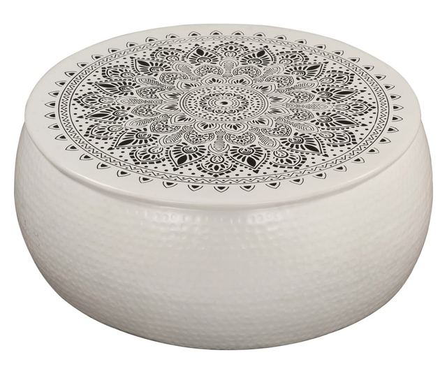 Izrađen od aluminija obrađenog čekićem, ovaj stolić za kavu je izdržljiv i visoke kvalitete. Naš stol ima čvrstu gornju površinu na koju možete staviti hranu ili piće ili izložiti ukrasne predmete poput okvira za slike ili čak biljke u posudama. Isporučuje se s prekrasnom slikom na površini stola. Privlačan izgled površine obrađene čekićem dodaje stoliću taktilnu teksturu.