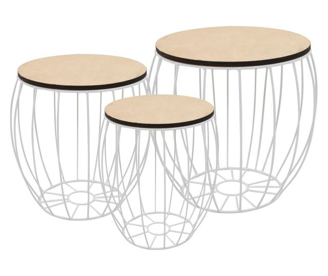 Površina od masivnog drva osigurava stabilnu površinu na koju možete postaviti pića, vaze ili druge ukrasne predmete. Uklanjanjem površine, bočni stol možete pretvoriti u košaru za pohranu. Osim toga, manji stol može se smjestiti unutar većeg kako bi se uštedio prostor. Čvrsti okvir od željeza obojenog elektrostatskim premazom upotpunjuje robusnu konstrukciju i daje setu industrijski izgled.