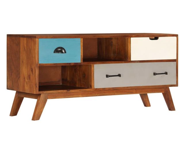 Ova TV jedinica izrađena je od masivnog bagremovog drva s medenim završetkom, što je čini izuzetno stabilnom i izdržljivom. Svaki korak procesa provodi se s najvećom pažnjom, bilo da se radi o poliranju, bojanju ili lakiranju. Vještina izrade i privlačna tekstura drva čine svaki komad namještaja jedinstvenim i malo drugačijim od ostalih. Tri ladice i dva pretinca za pohranu omogućuju vam jednostavno pohranjivanje digitalnih multimedijskih uređaja, igraće konzole, medijskih nosača ili drugih predmeta. Sastavljanje je jednostavno.