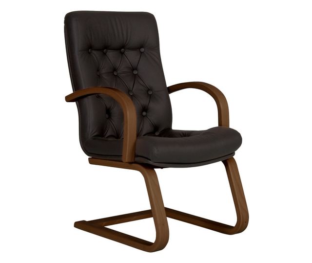 "Konferencijska/posjetiteljska stolica CHEF je udobna stolica s ergonomskim profiliranim sjedalom i naslonom, presvučena visokokvalitetnom prirodnom kožom LUX. Stolica je opremljena drvenim rukohvatima i okvirom.