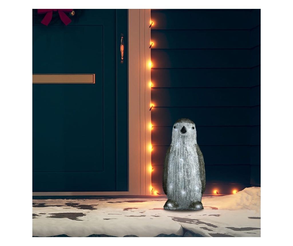 Ova figura u obliku pingvina izrađena je od izdržljivog akrilnog materijala. Dodatno, ova božićna dekoracija sadrži 20 LED dioda, koje su energetski učinkovite i dugotrajne. Dizajnirana s 8 različitih svjetlosnih efekata: kombinacija svih efekata, sporog sjaja, treperenja/bljeskanja, jurnjave/vodopada, sekvencijalno, uključeno, sporog blijeđenja, lijepo svijetli i stvara čarobnu svečanu atmosferu. Zahvaljujući vodootpornoj kutiji za baterije, figura pingvina može se koristiti i na otvorenom.