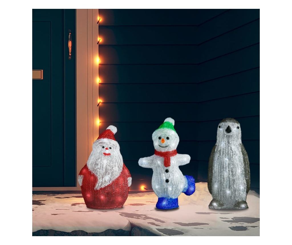 Ovaj set božićnih figurica izrađen je od čvrstog akrilnog materijala. Uključuje figuricu Djeda Mraza, figuricu snjegovića i figuricu pingvina. Dodatno, ova božićna dekoracija sadrži 75 energetski učinkovitih i izdržljivih LED dioda. Dizajnirana je s 8 različitih svjetlosnih efekata: kombinacija svih efekata, sporo svjetlucanje, treperenje/bljeskanje, u valovima, jurnjava/tekuća voda, sekvencijalno, stalno uključeno i sporo blijeđenje. Tako se figurice lijepo osvjetljavaju i stvaraju čarobnu svečanu atmosferu. Zahvaljujući vodootpornoj kutiji za baterije, set božićnih figurica može se koristiti i na otvorenom.
