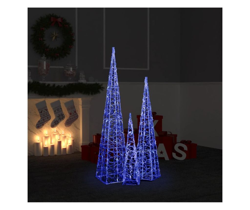 Set sadrži 3 svjetlosna čunja različitih visina. Tijelo ovog dekorativnog svjetlosnog čunja izrađeno je od akrila, što mu daje luksuzan, ledeni, sjajni izgled, osvjetljavajući okolno područje. Opremljen štedljivim LED diodama, pruža svijetlo i snažno osvjetljenje. Ima 8 različitih svjetlosnih efekata: kombinirani način, valni način, sekvencijalni način, polagano svjetlucanje, treperenje, polagano zatamnjenje, bljeskanje i kontinuirano osvjetljenje. Ovaj prekrasan set božićnih čunjeva i uključena kutija za baterije su vodootporni, što proizvod čini prikladnim za vanjsku ili unutarnju upotrebu.