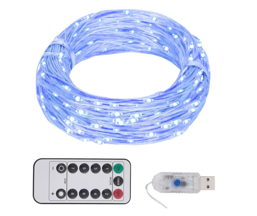 Instalacija je opremljena s 150 LED dioda, stvarajući plavi svjetlosni učinak. Ima 8 različitih svjetlosnih efekata; kombinirani način, val, sekvencijalni način, polako sjajni način, treperenje, polako zatamnjenje, bljeskanje i kontinuirano osvjetljenje. Zahvaljujući priloženom daljinskom upravljaču, lako možete upravljati svjetlom. Svjetlosna instalacija s bakrenom žicom može se lako saviti u bilo koji oblik koji želite. To je izvrstan dekorativni dodatak za osvjetljavanje vanjskog prostora, kao što su vrtovi, ograda, vrata, božićna drvca itd.