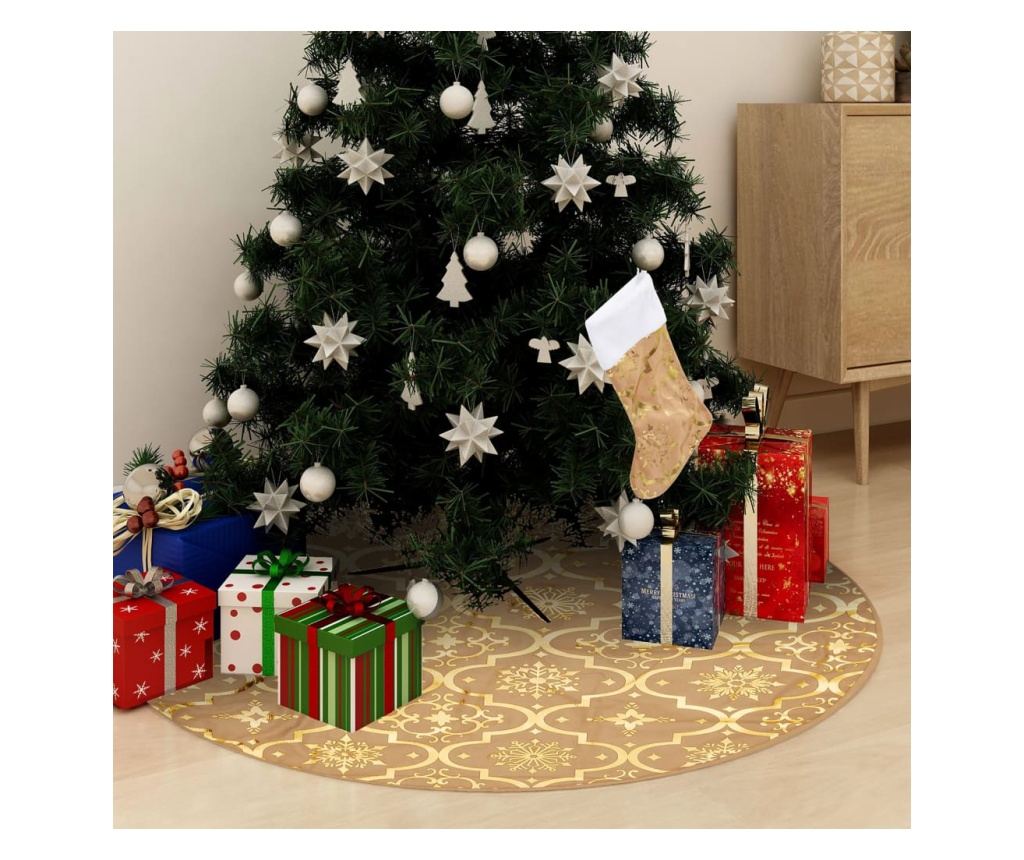 Ova mekana i topla podloga za drvce ima uzorke snijega koji odgovaraju blagdanskoj atmosferi. Također dolazi s odgovarajućom božićnom čarapom koja se može napuniti slatkišima, poklonima itd. Božićni ukras se lako može sklopiti kada se ne koristi, kako bi se koristio sljedeće godine.