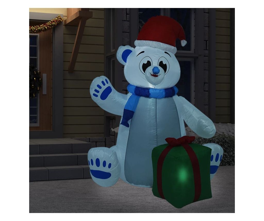 Ovaj prekrasni medvjed nosi šešir i šal, s poklonom pored ruke, dodajući dodatni šarm blagdanskoj atmosferi. Opremljen štedljivim LED svjetlima, polarni medvjed sjaji snažno noću. Može se lako napuhati ugrađenim ventilatorom i brzo ispuhati u kompaktnu veličinu za pohranu do sljedeće blagdanske sezone.