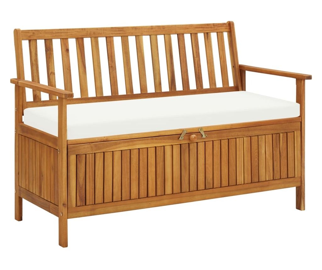 Izrađena od masivnog bagremovog drva, klupa je izdržljiva i čvrsta. Veliki pretinac za pohranu ispod sjedala nudi dovoljno prostora za organizirano i lako dostupno čuvanje raznih kućanskih predmeta. Nasloni za ruke i leđa, kao i uključeni jastuk za sjedalo, dodaju udobnost prostoru za sjedenje. Sastavljanje je jednostavno.