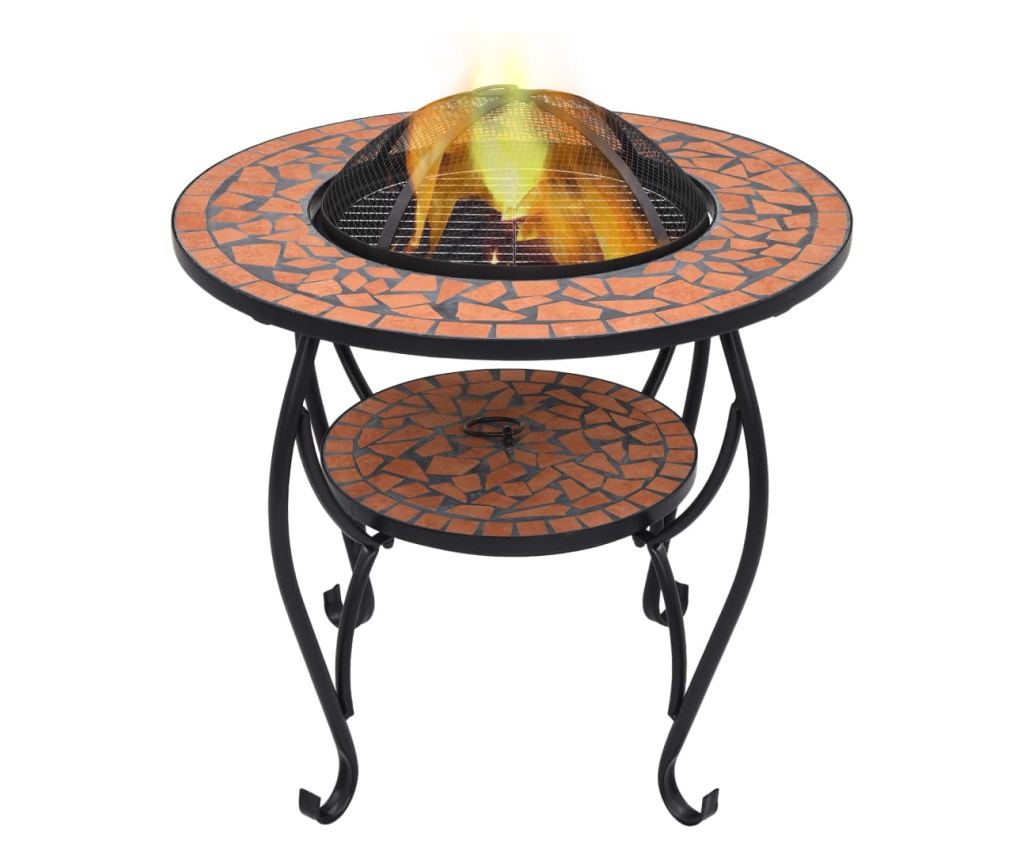 Izrađena od čelika, posuda za vatru izvrsna je za apsorpciju i zračenje topline. Može se koristiti za spaljivanje suhog drva, trupaca ili ugljena. Vatra je podržana postoljem s četiri noge. Uključena sigurnosna mreža omogućuje vam da promatrate plamenove, ali okružuje vatru radi sigurnosti, kako bi se spriječile eventualne iskre ili ostaci iz vatre. Kukica se može koristiti i za uklanjanje mrežastog poklopca i za preuređivanje trupaca ili ugljena. Osim toga, stol s vatrom može se koristiti i kao roštilj. Njegova okrugla keramička površina nudi savršeno mjesto za piće i dodatke za roštilj.