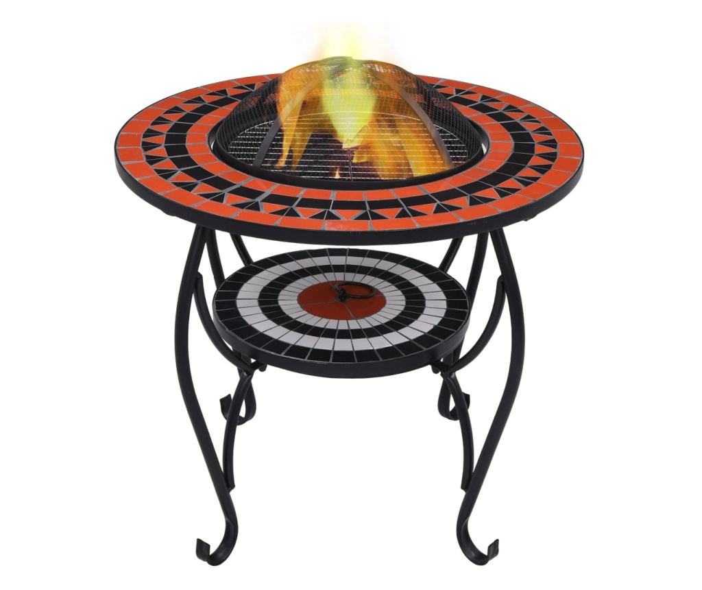 Izrađena od čelika, posuda za vatru izvrsna je za upijanje i zračenje topline. Može se koristiti za spaljivanje suhog drva, trupaca ili ugljena. Vatra je podržana postoljem s četiri noge. Uključena sigurnosna mreža omogućuje vam promatranje plamena, ali okružuje vatru radi sigurnosti, kako bi se spriječile eventualne iskre ili ostaci iz vatre. Kukica se može koristiti i za uklanjanje mrežastog poklopca i za preuređivanje trupaca ili ugljena. Osim toga, stol s vatrom može se koristiti i kao roštilj. Njegova okrugla keramička površina nudi savršeno mjesto za piće i dodatke za roštilj.