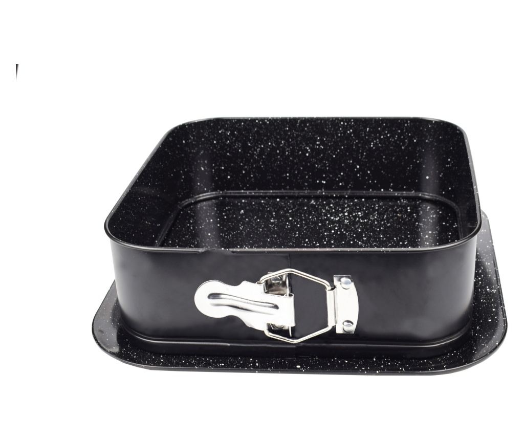 Posuda s oprugom s kvadratnom bazom • izdržljivi kalup od ugljičnog čelika • Dimenzije 24 x 24 x 8 cm • Debljina materijala: 0,4 mm • Non-stick premaz • Boja otporna na toplinu • s integriranom pločom za posluživanje • Može se prati u perilici posuđa
