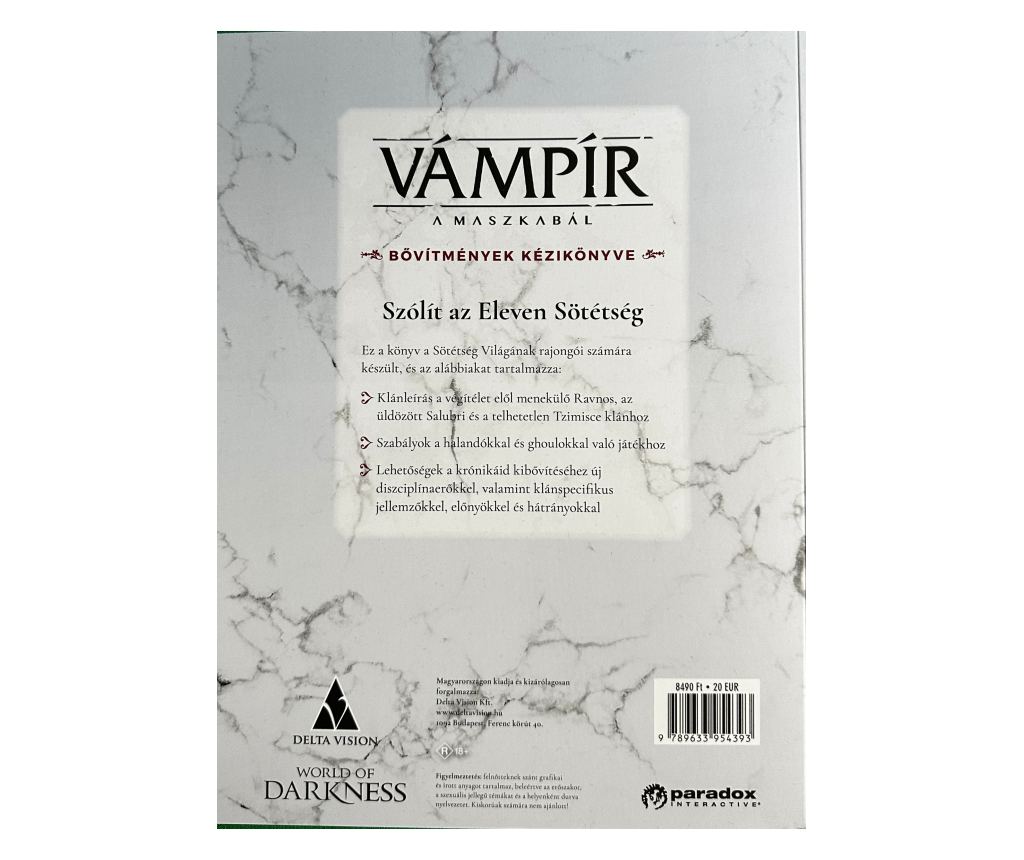 Fedezd fel a vérszomj és hatalomvágy sötét labirintusát a Bővítmények kézikönyve kiegészítővel, ahol a legendás Ravnos, Salubri és Tzimisce klánok titkai várnak rád. Alkoss meggyőző történeteket halandók és ghoulok bőrében, fesd ki krónikádat új diszciplínákkal és klánspecifikus fortélyokkal, mindezt egy olyan világban, ahol minden sarkon csábítás leselkedik.