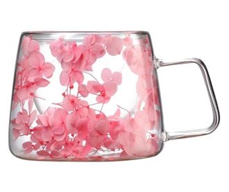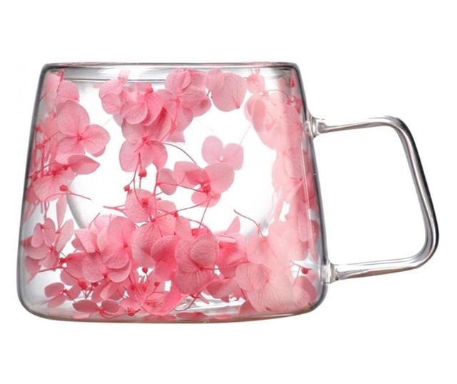 Ružičasta šalica sa suhim cvijećem, dvostruka stijenka, borosilikatno staklo, toplinska izolacija, hortenzija, 180 ml
