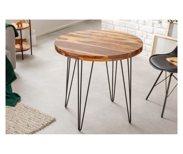 Tehničke specifikacije: Dimenzije: 80 cm (Š) x 75 cm (V) x 80 cm (D) Debljina ploče: 50 mm Materijal: Puno drvo (sheesham), metal Boje: Prirodna, crna Težina: 25.6 kg Ovaj stol savršeno se uklapa u moderni industrijski stil, ali i u prostore s daškom vintage šarma. Zamislite ga u blagovaonici, gdje će postati središnja točka obiteljskih okupljanja, ili u kuhinji, kao idealno mjesto za jutarnju kavu. Njegova kombinacija prirodnog drva i crnog metala unijet će toplinu i karakter u svaki prostor, izazivajući divljenje vaših gostiju.