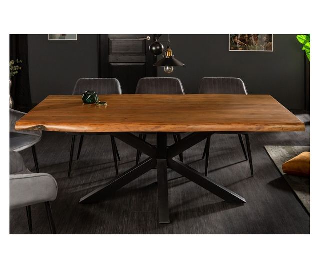 Tehničke informacije - Materijal: drvo, metal - Boje: prirodna ploča, crni okvir - Dimenzije: 180 cm x 77 cm x 100 cm (ŠxVxD) - Težina: 122.7 kg - Debljina ploče: 60 mm - Noge stola: 7,5 cm x 7,5 cm (ŠxD) Ovaj blagovaonski stol nije samo komad namještaja; on postaje središnja točka svakog okupljanja. Zamislite obiteljske večere uz svjetlost svijeća, dok se vaši najmiliji okupljaju oko stola, dijeleći smijeh i uspomene. Njegova prirodna boja drva savršeno kontrastira s crnim okvirom, stvarajući izgled koji će svakog gosta ostaviti bez daha. U dnevnom boravku, ovaj stol će privući pažnju i postati tema razgovora, ističući vašu jedinstvenu estetiku i stil. Bez obzira na priliku, ovaj stol donosi toplinu i eleganciju svakoj prostoriji.